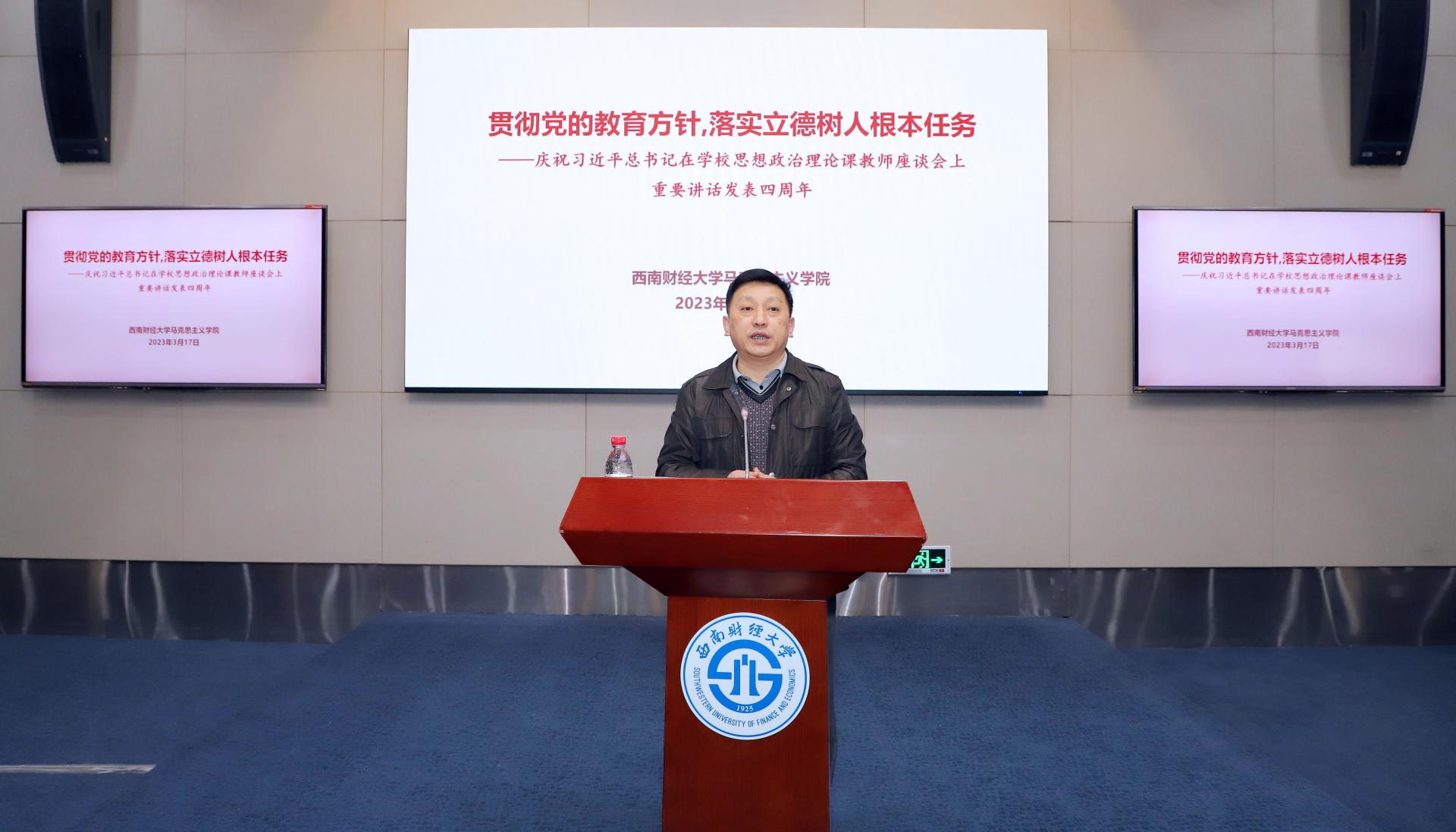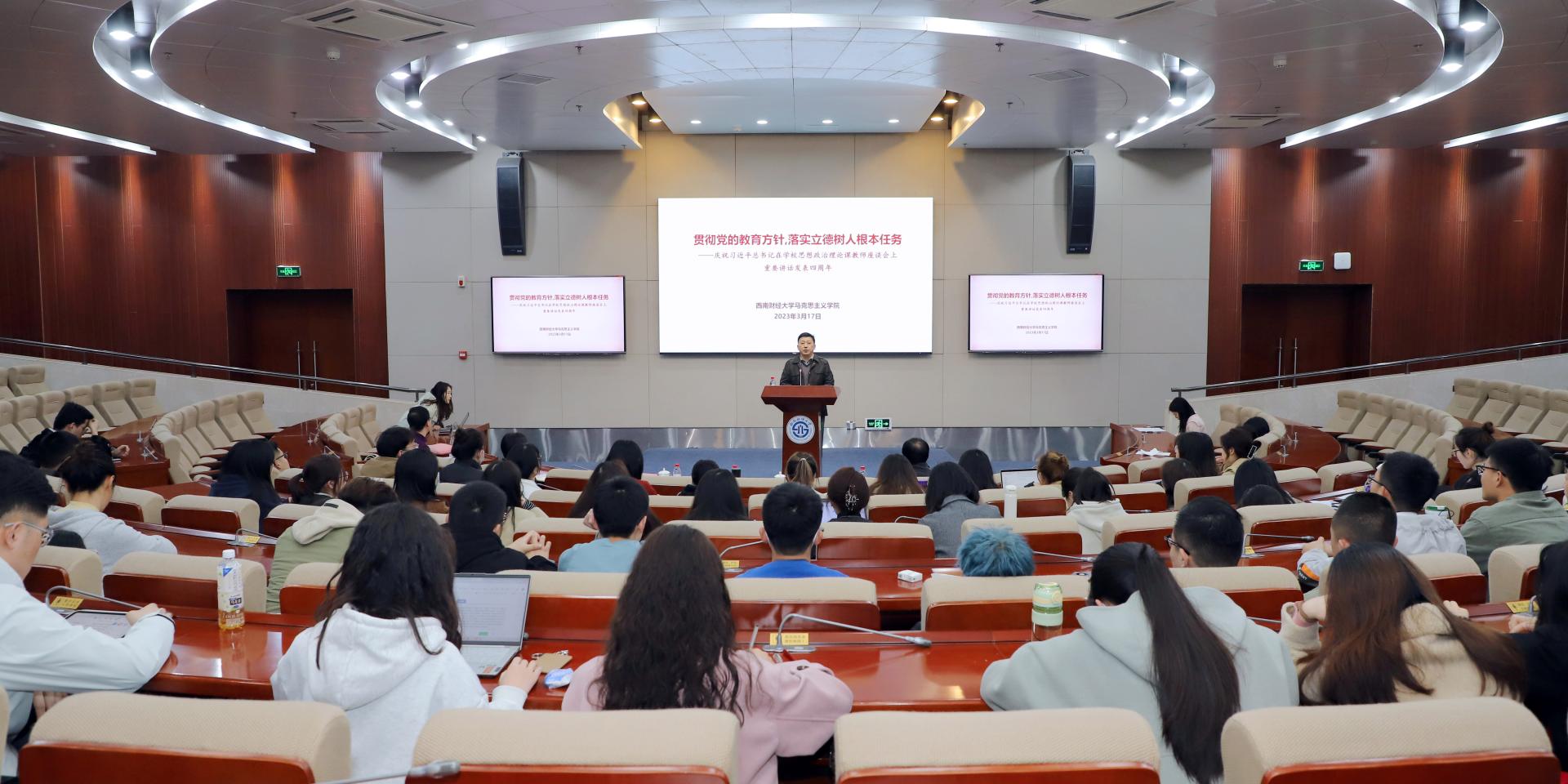 在习近平总书记主持召开学校思想政治理论课教师座谈会并发表重要讲话四周年来临之际,2023年3月17日下午,西南财经大学5357cc拉斯维加斯组织学院师生举行“深入学习贯彻习近平总书记‘3·18’重要讲话精神,奋力推进思政课立德树人”座谈会,在学校思想政治理论课教师座谈会重要讲话发表四周年”座谈交流会,学院领导班子成员、思政课教师、辅导员、研究生共一百余人参加座谈会。