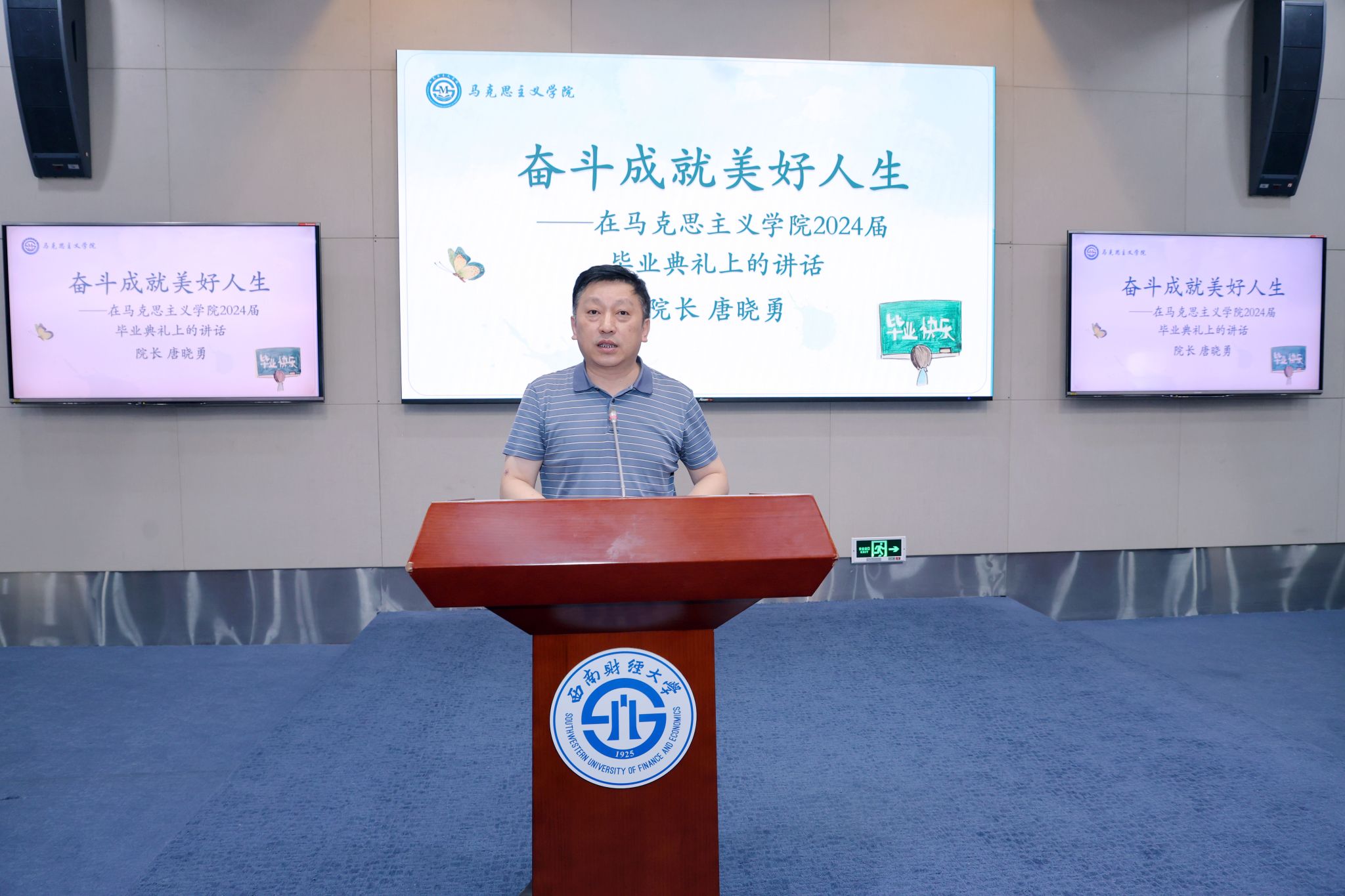 学院院长唐晓勇以“奋斗成就美好人生”为题,为即将踏上新征程的毕业生们送上临别致辞,向圆满完成学业的硕博士毕业生表示最热烈的祝贺,向辛勤培养的父母和老师们表示了最衷心的感谢和崇高的敬意。希望同学们在以后的人生道路上要牢记理想是通往美好未来的航标,奋斗是追求美好未来的通行证,学习是通往美好未来的路由器,勉励大家在学习和新的岗位上不断增强“四个意识”、坚决拥护党“两个确立,为中国式现代化砥砺奋斗,不断开拓学习和工作的新局面,走实美好人生新路程。希望毕业生同学们一如既往地关注、关心和支持学校、学院的建设和发展,共庆西财马院二十岁华诞,同迎母校一百岁生日。