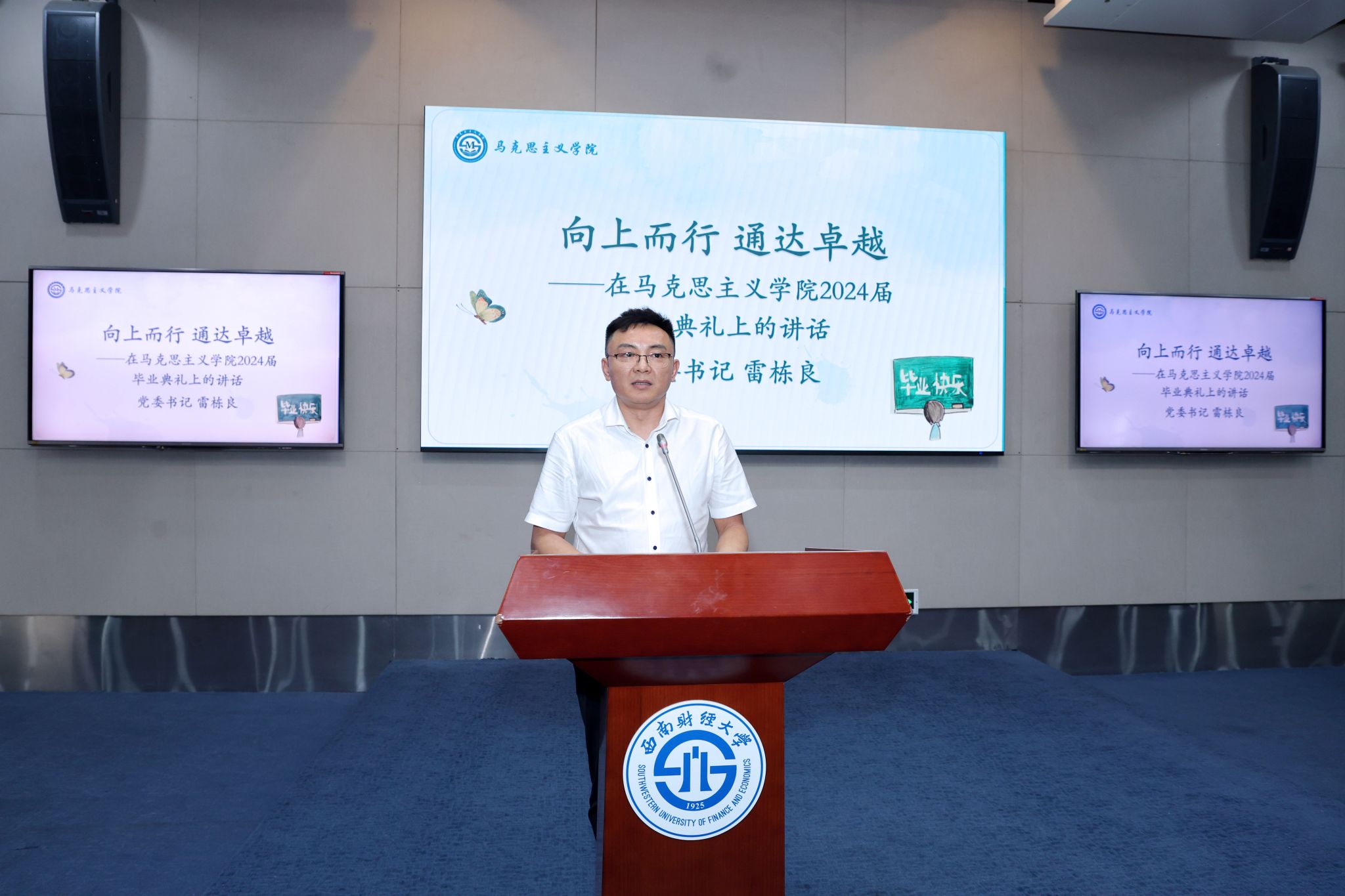 最后,学院党委书记雷栋良以“向上而行,通达卓越”为题为全体毕业生讲最后一堂思政课,围绕如何“走稳、走远、走好”职场人生路,希望毕业生在“定”上稳内核,保持定力耐力;在“辨”上用智慧,学会做人识人;在“磨”上做文章,打磨性格、打磨格局、打磨能力;在“扛”上求坚韧,保持清醒的头脑和坚定的意志,要有所为、有所不为,运用智慧和知识不断地开展实践和探索,勇敢地扛起各种挑战和困难,学会将压力转化为前进的动力,把个人发展与祖国需要统一起来。希望同学们牢记马院永远是大家的精神家园,祝愿大家自此坦途、一路繁花,在五湖四海、大江南北各条战线上,努力成为传播党的创新理论的“播火者”。