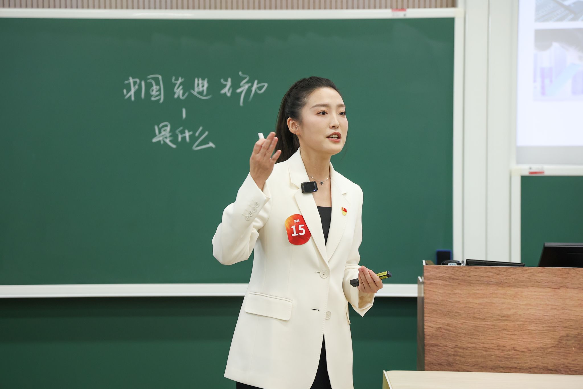 决赛中,宋婧琳老师主讲《世纪之交中国先进生产力对党提出了怎样的发展要求?》节段,详细阐述了中国先进生产力的发展要求对党和国家战略制定所起到的重要作用,充分展现了她扎实的跨学科知识储备、严密的教学逻辑和沉稳的教学风格。