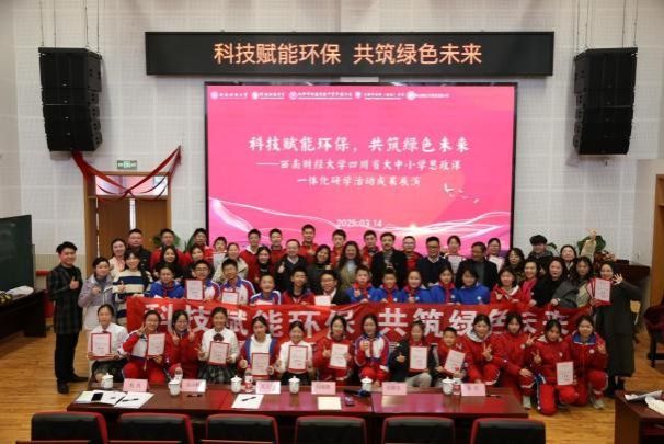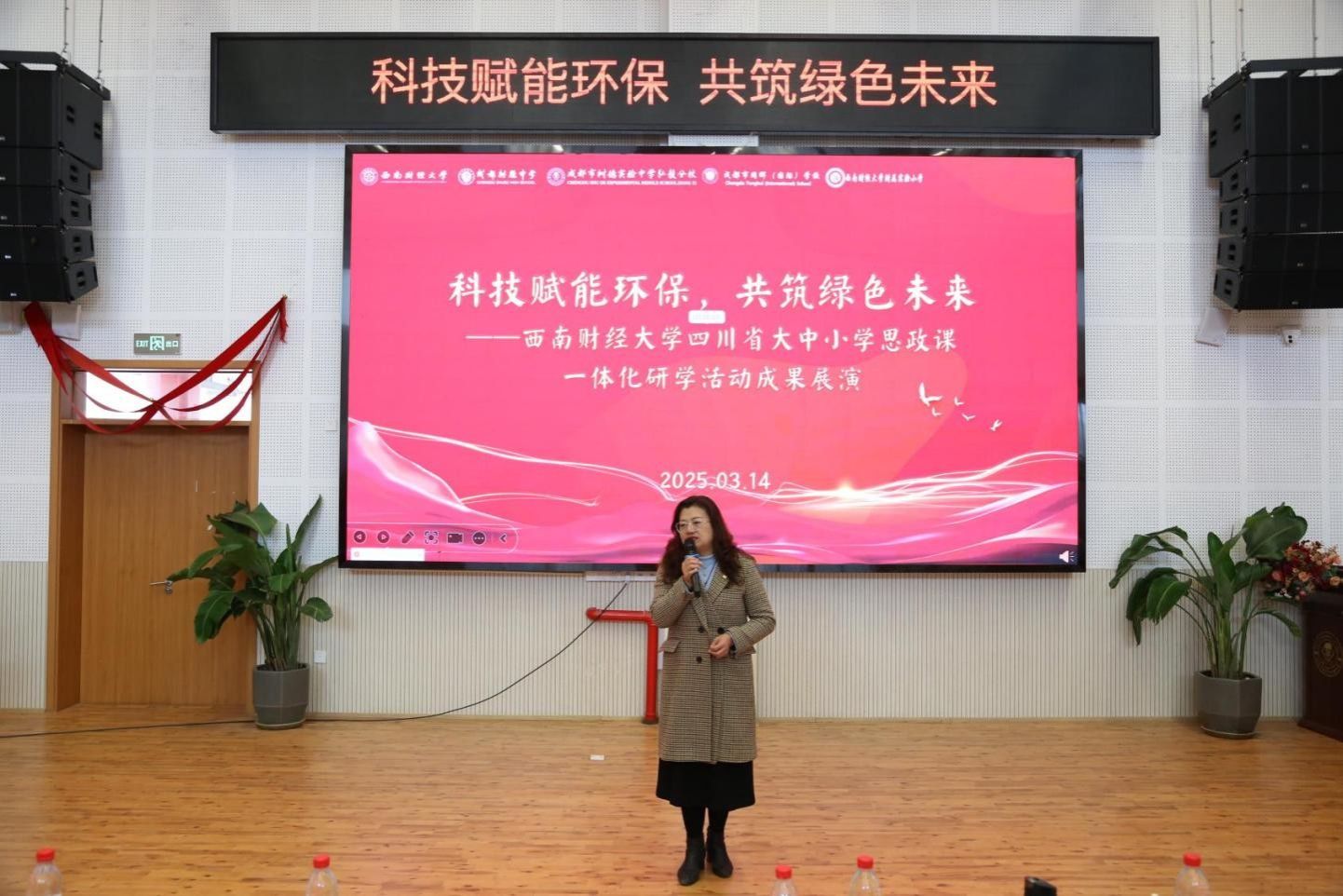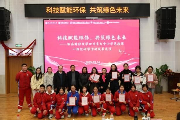 在此背景下,西南财经大学四川省大中小学思政课一体化共同体研学活动成果展演于 2025 年3月14日在成都市树德实验中学弘毅分校开展。本次活动以“科技赋能环保,共筑绿色未来”为主题,旨在通过研学实践,引导学生在真实情境中探索科技环保,培养社会责任感和创新实践能力,推动思政教育与学科教学深度融合,助力学生成长。