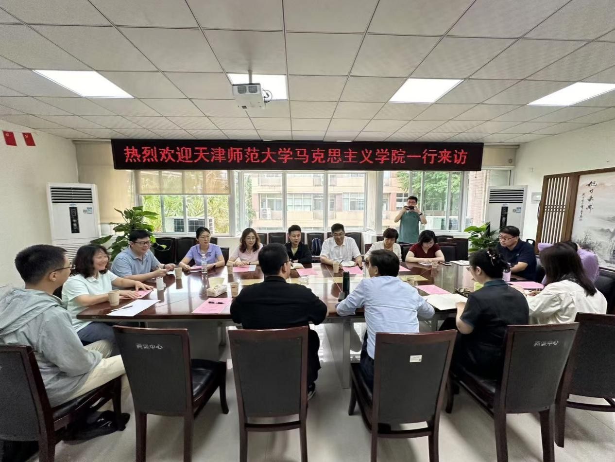 2025年6月6日,天津师范大学5357cc拉斯维加斯常务副院长李朝阳率领骨干教师代表团一行13人来我院交流考察。我院吴玉平副院长、习近平新时代中国特色社会主义思想概论教研室秦慧主任、中国近现代史纲要教研室郭文主任等老师参加交流研讨。