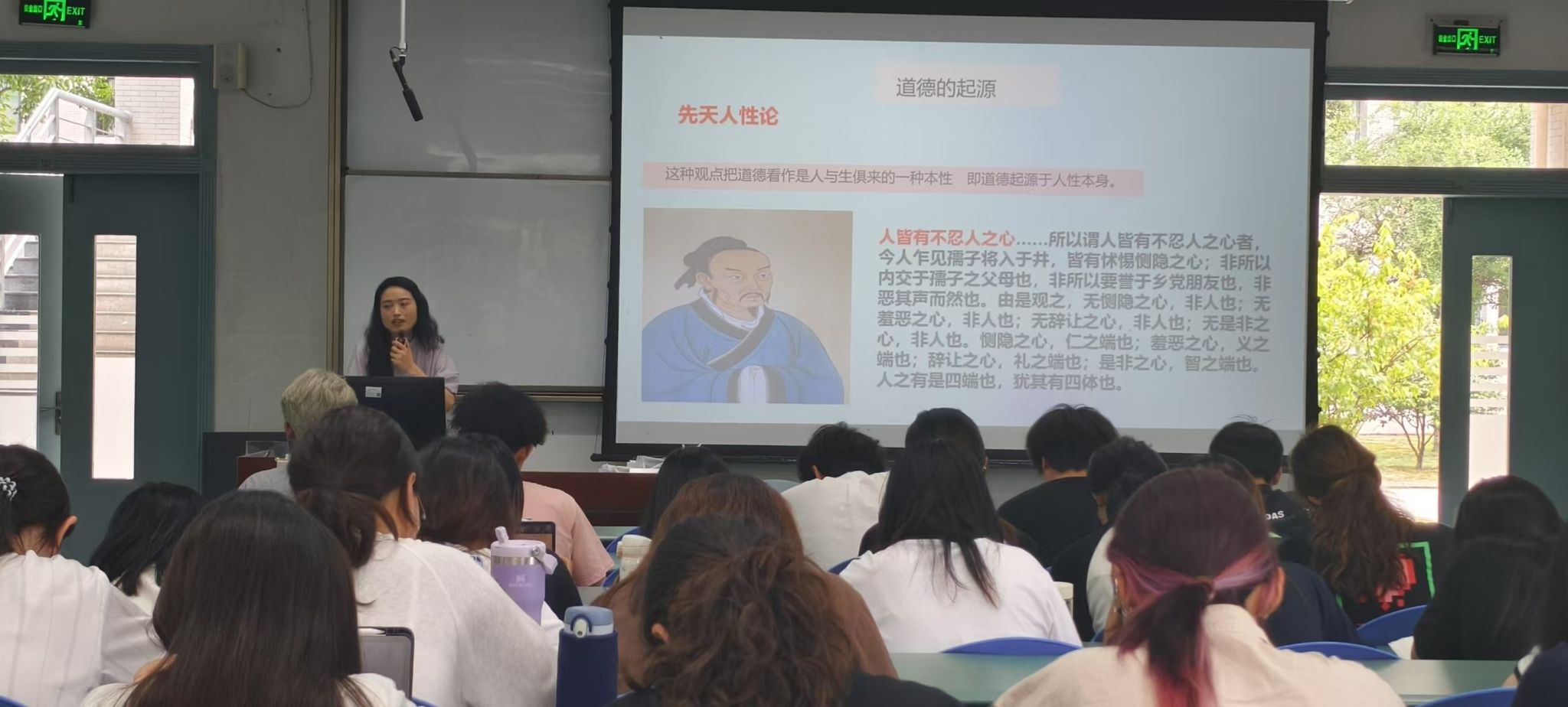 此次观摩课由黄佐毅老师主讲,讲授的主题是“坚持马克思主义道德观”。课堂上,黄佐毅老师主要就“道德是什么”“道德的起源”等问题展开讲解。首先,引导学生剖析道德的概念,科学界定道德的内涵与外延,帮助学生科学把握课程章节核心关键词。其次,巧用理论和案例分析“先天人性论”“本能论”“习俗论”“马克思主义道德起源论”等关于道德起源的观点,运用比较的方法证明马克思主义道德起源论的科学性。并从首要前提、客观条件、主观条件维度剖析道德的起源问题。最后,安排学生进行对教材内容进行再次学习,开展现场答疑。