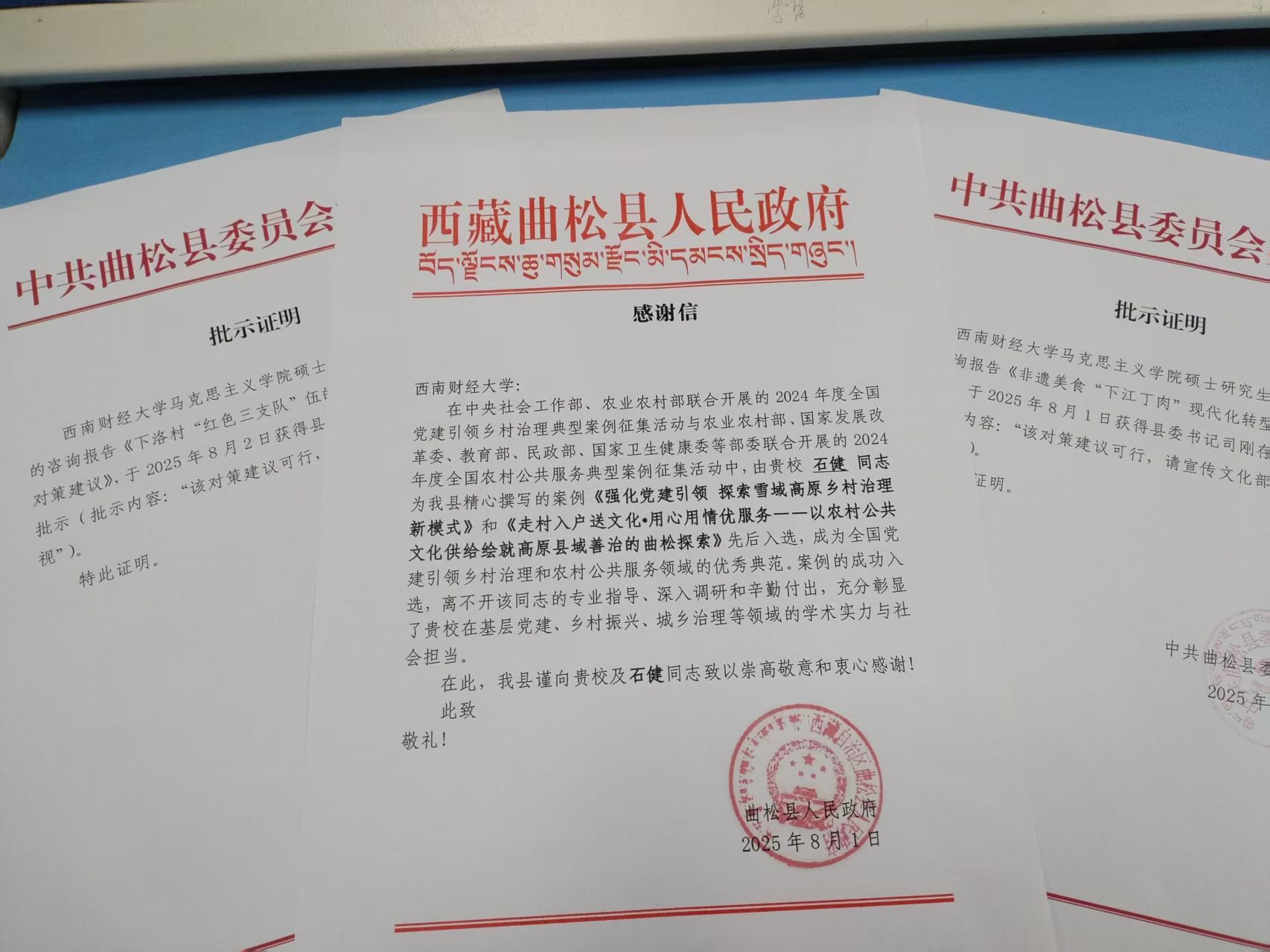 自去年5月以来,我院积极服务地方经济社会发展,组建了由教师石健牵头负责,张常靖、刘雨欣、雷依悦、罗秀元等研究生深度参与的服务西藏曲松县研究团队,聚焦雪域高原民族团结进步、边疆乡村振兴、基层党建、文化传承等工作,助力该县获得多项“国字号”荣誉,相关成果多次获中央社会工作部、教育部、农业农村部、国家发展改革委、民政部、国家卫生健康委等部委充分肯定。