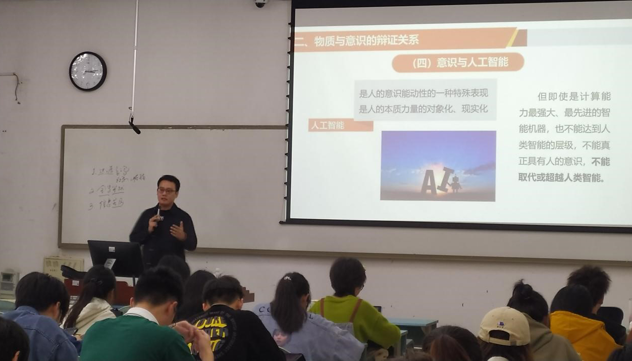 许鹏老师站在马克思主义哲学的高度,运用了丰富的实例、影视作品等实际材料来激发学生的思考。他明确指出,人工智能是人的意识能动性的一种特殊表现,因此即使是最强大和最尖端的人工智能也无法达到人类智能的层次,无法真正拥有人的意识,更无法替代或超越人类智能。在课程的结尾,许鹏老师强调了在现实生活中,我们需要充分利用人工智能的同时,也要警惕人工智能可能带来的风险,以引导其朝着有利于人类生存和发展的方向发展。