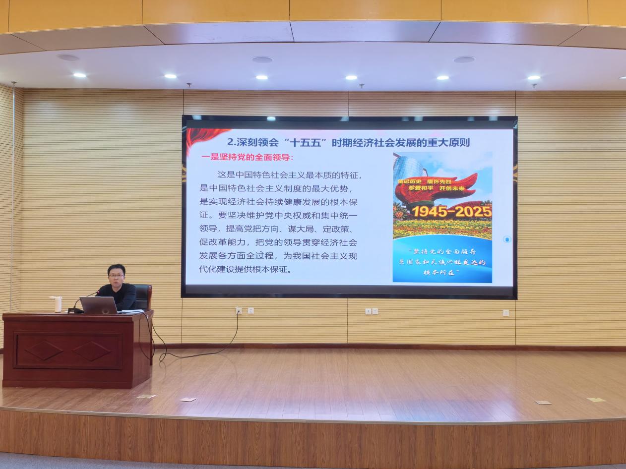 党课上,张明书记系统解读了党的二十届四中全会精神,详细介绍了全会的基本情况、核心成果,以及《中共中央关于制定国民经济和社会发展第十五个五年规划的建议》的起草过程与框架结构,强调了“一个引领、六大原则、七方面目标、十二项重要部署、一个保障”的核心内涵。张明书记结合“十四五”时期我国在经济运行稳中有进、科技创新突破等领域的重大成就,分析了“十五五”时期作为基本实现社会主义现代化关键阶段的承前启后地位,深入阐释了国际国内发展形势与我国面临的战略机遇和风险挑战,并围绕建设现代化产业体系、科技自立自强、高水平社会主义市场经济体制等12项战略任务,以及坚持党的全面领导这一根本保障进行了重点讲解,鼓励同学们将专业所学与国家发展需求相结合,以理论实践助力中国式现代化建设。