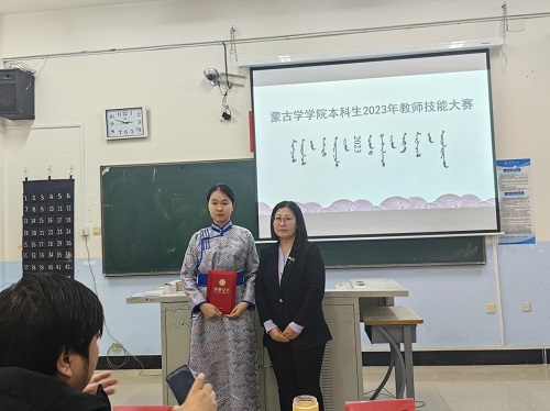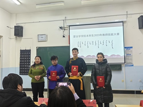 在授课环节,各参赛选手准备充分,教学过程设计合理,语言表达准确生动,教学方法独特新颖。选手们自然流畅,富有创意地语言,端庄大方,挥洒自如的仪态彰显出了师范生们扎实的教学基本功以及洋溢着朝气与热情的风采。赛后玉荣副院长做精彩点评。经过激烈的竞争,2022级蒙文班娜哈雅获得一等奖;23蒙文班特力贡、20蒙班朝宝力格获得二等奖;22级蒙文班呼斯乐、21级蒙班爱丽亚、20蒙文班乌仁陶古斯获得三等奖;22级蒙文班双胡尔、21级应用班王俐俐获得优秀奖。