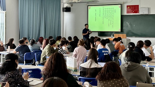 额尔敦陶格套副教授围绕“设计作业”这一关键词,讲授了作业的意义、形式、要求等内容。额尔敦陶格套副教授从作业的实际意义出发,探讨了课外作业与课堂作业的具体意义,认为作业既能培养学生的语言能力、写作能力、思考能力,更有培养学生兴趣、丰富教学活动、体现学生主体地位的多重作用,进而使学生对所学知识融会贯通,起到举一反三的作用。额尔敦陶格套副教授,从培养作业兴趣的角度出发,认为教师应该注重“作业形式”的多样性,通过拓展作业、课前作业、小组作业、阅读作业、口头作业、书面作业、实践作业,培养学生的听、说、读、写能力。同时也要充分考虑不同阶段以及不同层次的学生,做到作业难度适中、要求明确、题目类型多样。问答环节中,教师与学生们积极提问,现场氛围热烈。额尔敦陶格套副教授全程与学生进行互动,真正的调动了学生的积极性与主动性,鼓励学生积极参与问答环节,使学生的思维处于积极活跃的状态,真正达到了“模范教师”的带领作用。