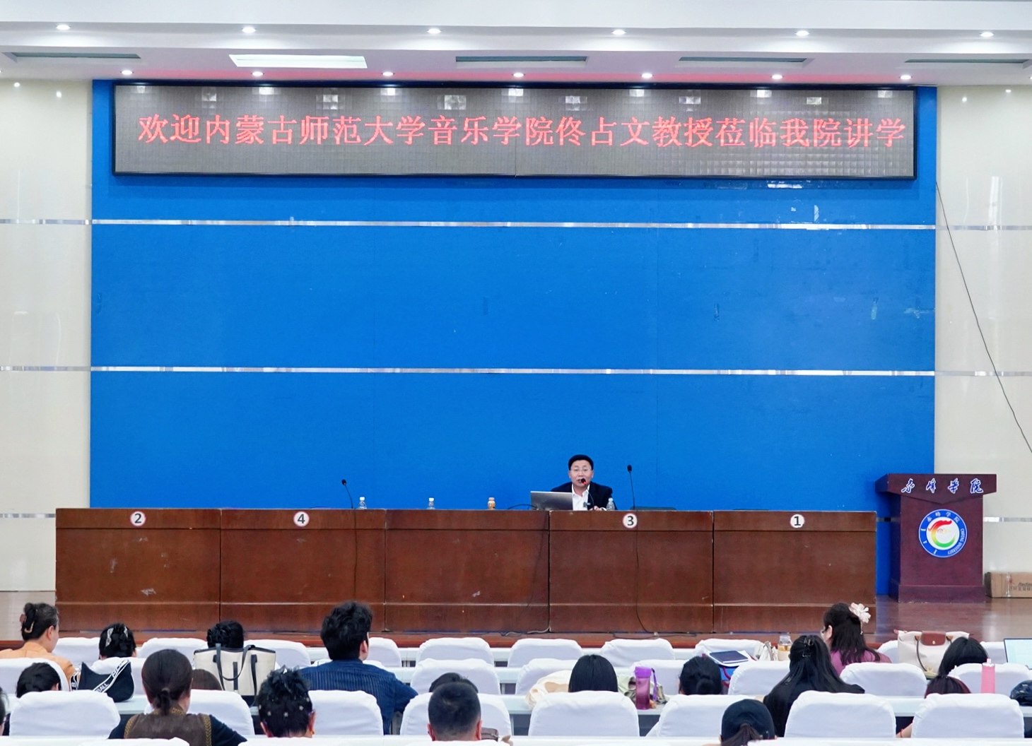 本次讲座邀请了内蒙古师范大学与内蒙古艺术学院硕士研究生导师、泰国宣素那他皇家大学艺术学院博士生导师佟占文教授授课,以《北方少数民族音乐与昭乌达民歌保护传承研究》《深耕音乐田野重构教研新境——兼谈田野调查在高校音乐学科建设中的作用》为主题,从北方少数民族音乐的文化底蕴和独特魅力出发,结合昭乌达民歌的发展历史、艺术特点,分析了当前民歌保护传承面临的机遇与挑战,分享了在传承实践中的宝贵经验和创新思路,并结合自身丰富的田野调查经历,阐述了田野调查在高校音乐学科建设中的重要作用,为师生带来了一场内容丰富、极具启发性的学术盛宴。