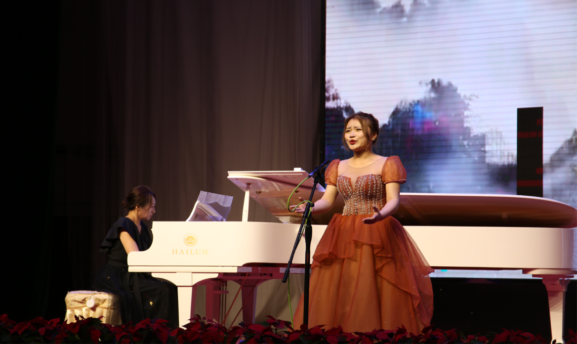 音乐会一开始,高亢的女声独唱《秋风词》便瞬间点燃了现场的氛围,那恢弘的旋律,深情的演唱博得了在场同学的阵阵掌声。