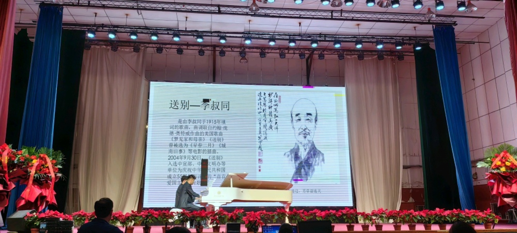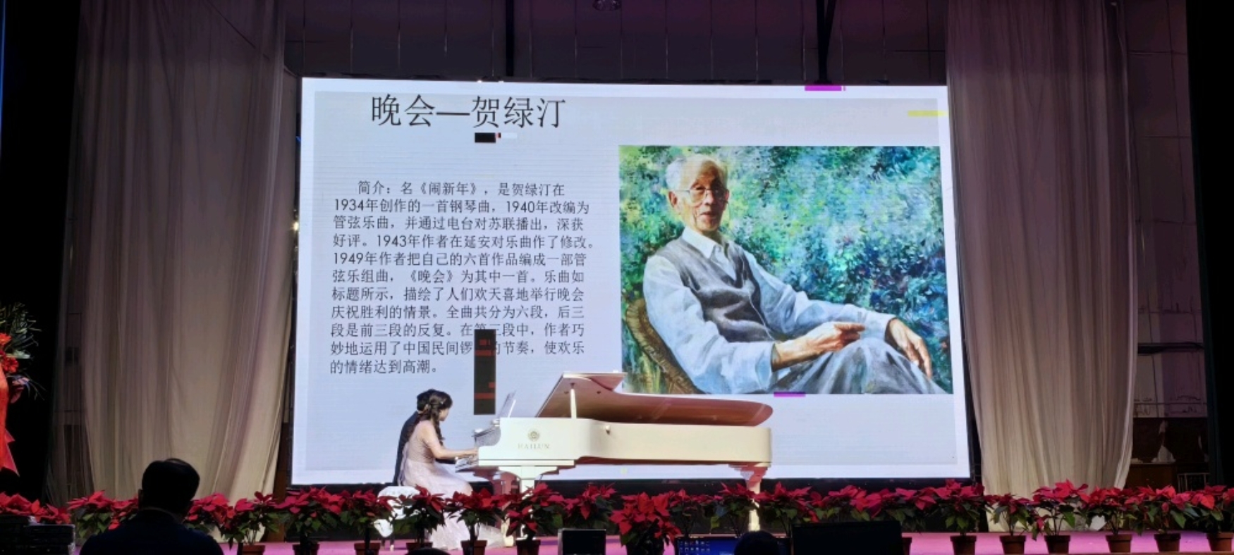 音乐会以欢快而有活力的钢琴曲《晚会》开场,老师和同学弹奏的自然真挚,音乐表现生动、流畅、线条优美,描绘了人们欢天喜地举行晚会,庆祝胜利的情景,同时,将音乐会的气氛推向高潮。