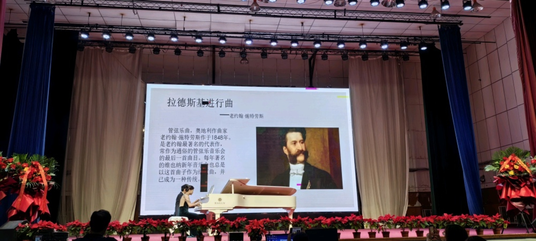 最后在欢乐的《拉德斯基进行曲》后结束了本场音乐会。整首曲子激昂铿锵有力,充满了欢庆的气氛,音乐恢弘而壮丽,旋律热烈而辉煌。台下的听众都沉浸在欢乐愉悦之中,气氛欢腾热烈。