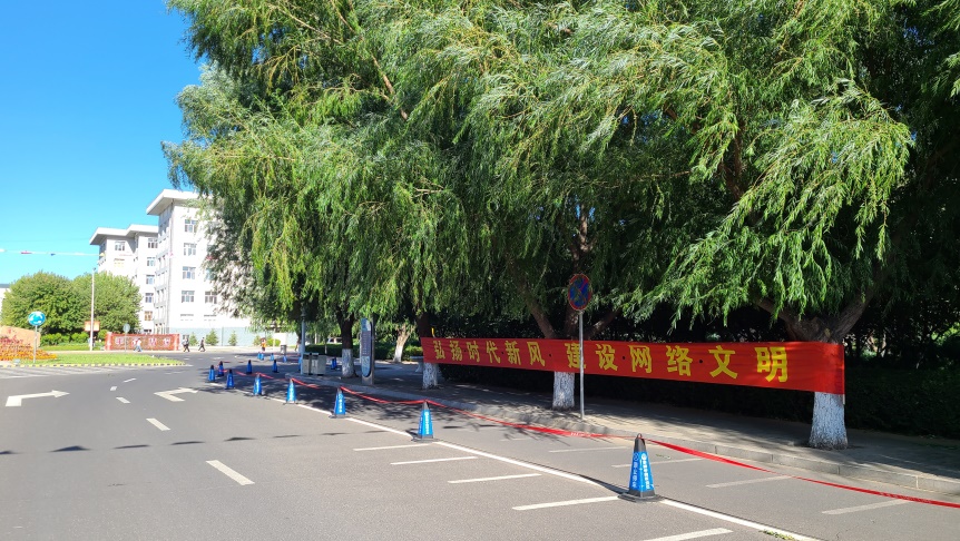 网络安全宣传标语横幅内容分别为:“弘扬时代新风 建设网络文明”、“网络安全为人民 网络安全靠人民”、“加强数据安全和个人信息保护”、“保护个人信息安全关乎你我他”,为更高频率的得到师生的共鸣,横幅分别悬挂在师生出现频次高显而易见的位置,位置有学校主校门口、风雨操场、学生公寓等(见下图)。