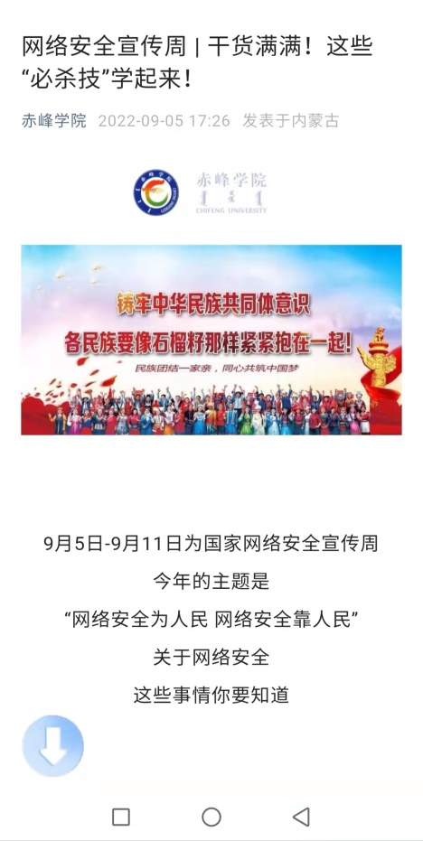 根据自治区教育工委、中共赤峰市委网信办印发的《关于开展2022年内蒙古自治区国家网络安全宣传周暨“校园日”主题宣传活动通知》及《关于印发“赤峰市2022年国家网络安全宣传周活动方案”的通知》要求,结合beat365实际情况为进一步做好9月5日至11日期间国家网络安全宣传周和9月6日校园日宣传活动,制定网络安全宣传方案,按照活动方案开展如下活动: