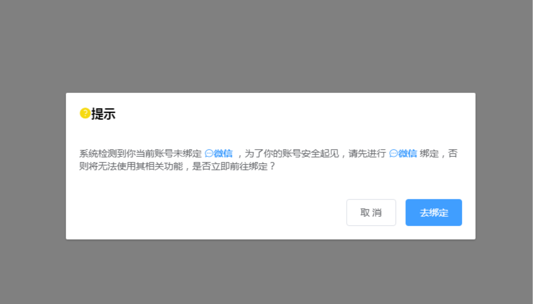 登录进入系统,会提示绑定微信,点击“去绑定”,弹出二维码图片。