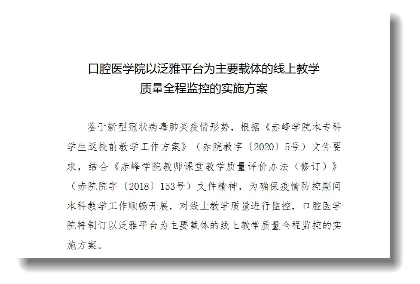 口腔医学院制定了《以泛雅平台为主要载体的线上教学质量全程监控的实施方案》。