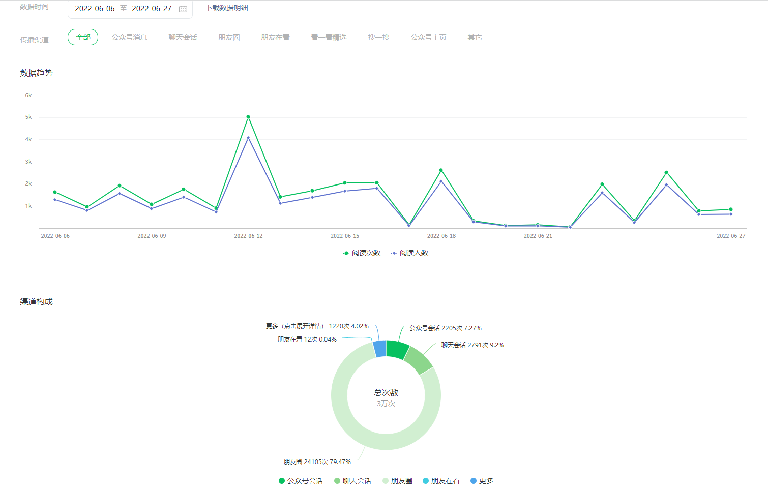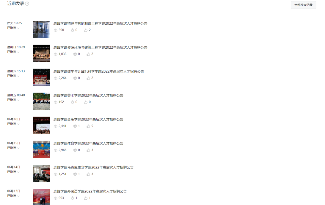 本次高层次人才招聘公告的推送工作开始于6月6日,截至目前,共定制并推送了蒙古学学院、历史文化学院、文学院等15个二级学院的招聘公告,平均每篇招聘公告的阅读次数为2022次,阅读人数为1637人;总阅读次数达到3万次,总阅读人数达到2.5万人。其中,单日最高阅读量出现在6月12日推送的教育科学学院的招聘公告上,阅读次数达到了5015次,阅读人数超4000人。