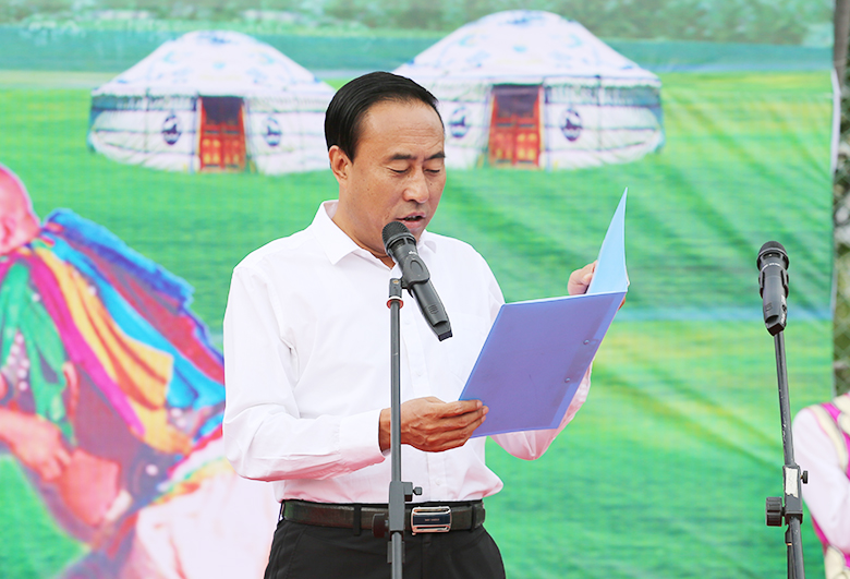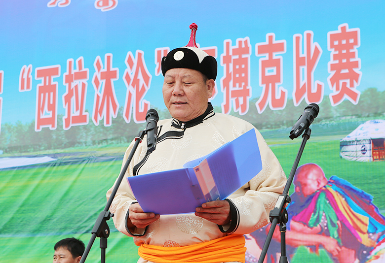 仪式上,徐振军副院长宣布“赤峰市大中专院校搏克联盟第十四届‘西拉沐沦’杯搏克比赛开幕”。