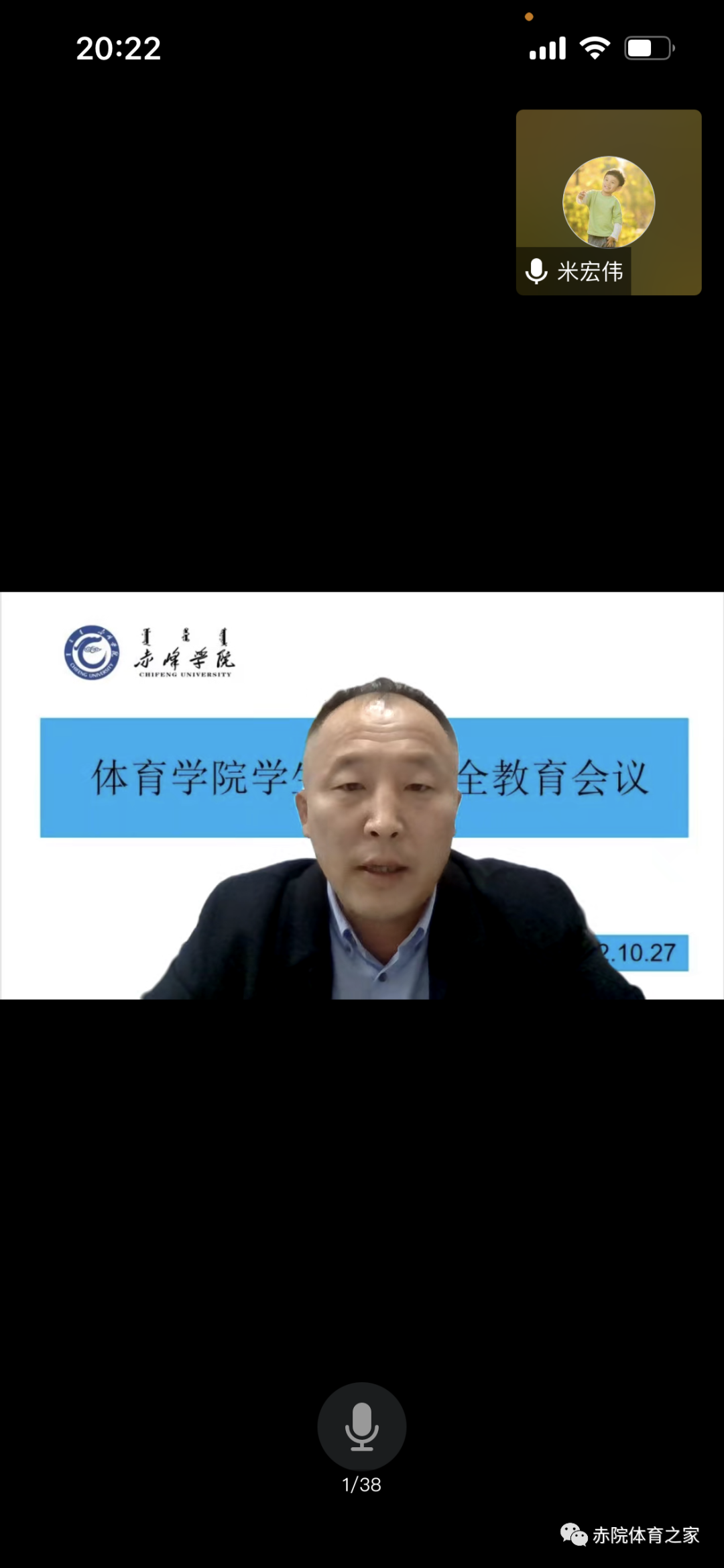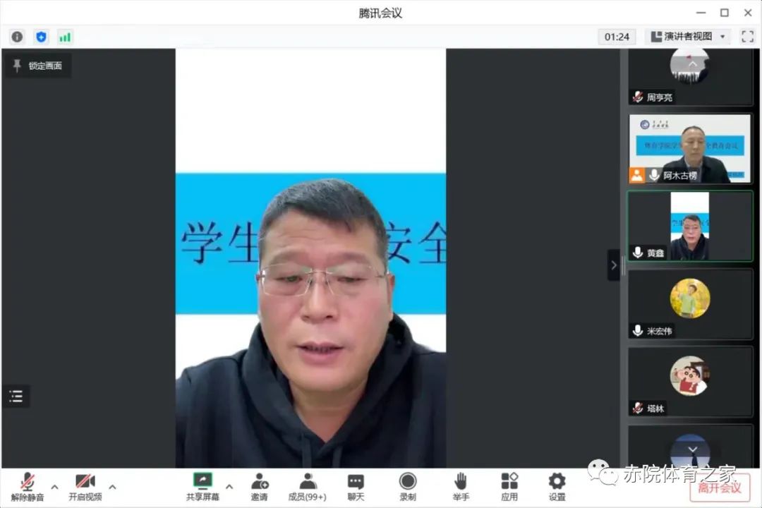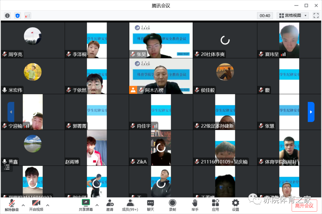 为加强学生疫情防控意识,加强学生的安全纪律教育,增强体育学院学生的安全意识、维护校园安全,筑牢校园疫情防控工作。体育学院于10月27日晚采用线上腾讯会议召开体育学院学生纪律安全教育会议。会议由体育学院党总支副书记黄鑫主持,体育学院党总支副书记(主持党总支工作)阿木古楞带领体育学院全体辅导员和体育学院全体学生参加了本次会议。