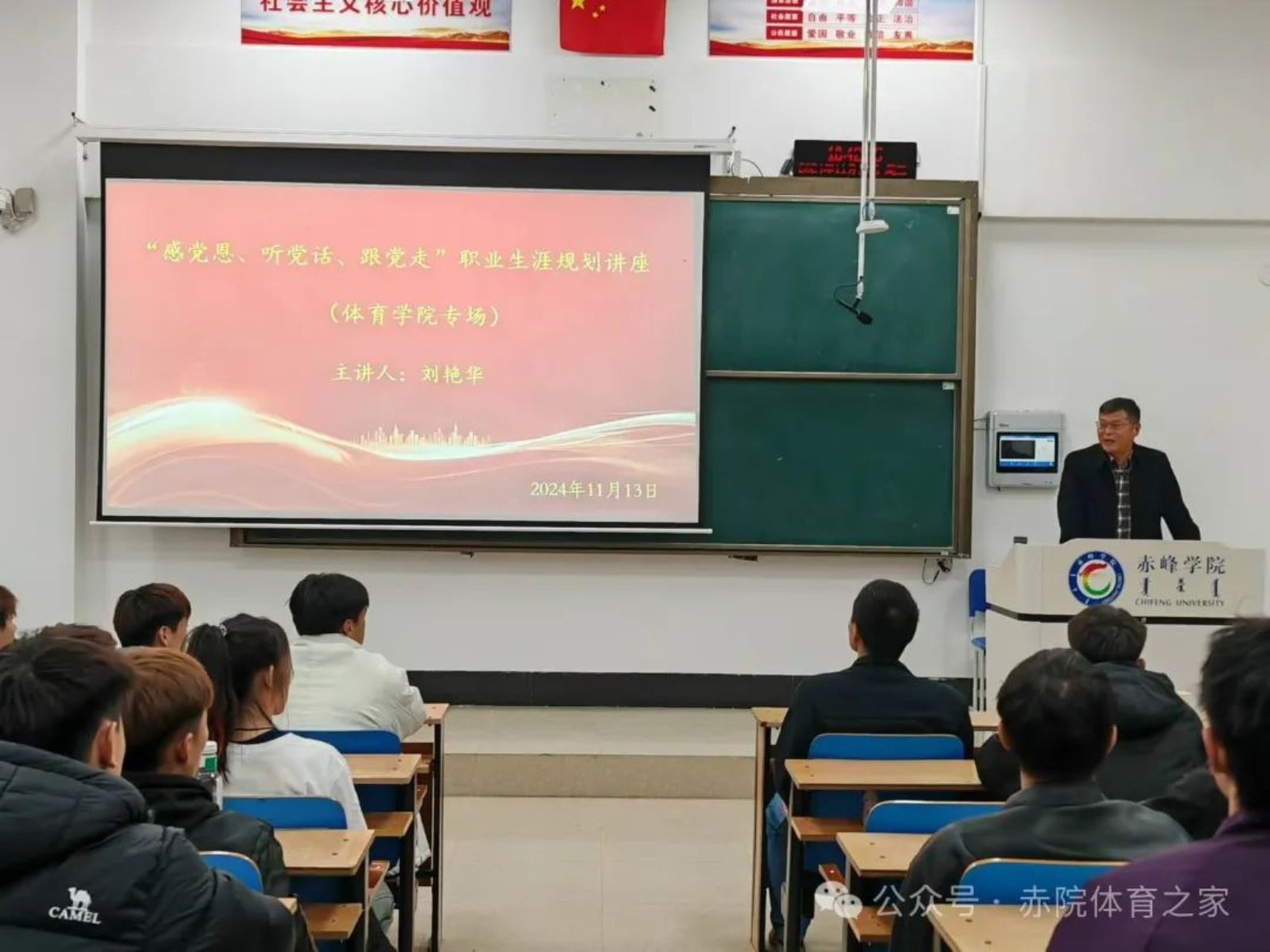 11月13日,一场别开生面的职业生涯规划讲座在beat365官方网站体育学院成功举行,主题为“感党恩、听党话、跟党走”。此次讲座由beat365官方网站人事处副处长、副教授刘艳华主讲,体育学院党总支副书记黄鑫、团总支负责人米宏伟老师,班导师王晓辉,迟凤红老师,辅导员邢也健,杨珊珊老师共同参与,为学生们带来了一场充满智慧与启迪的盛会。讲座伊始,黄鑫副书记发表了开场致辞,他强调了职业生涯规划对于体育学院学生的重要性,并鼓励大家在“感党恩、听党话、跟党走”的引领下,将个人职业发展与党和国家的体育事业紧密结合。黄副书记的致辞迅速点燃了现场的气氛,学生们对接下来的讲座内容充满期待。