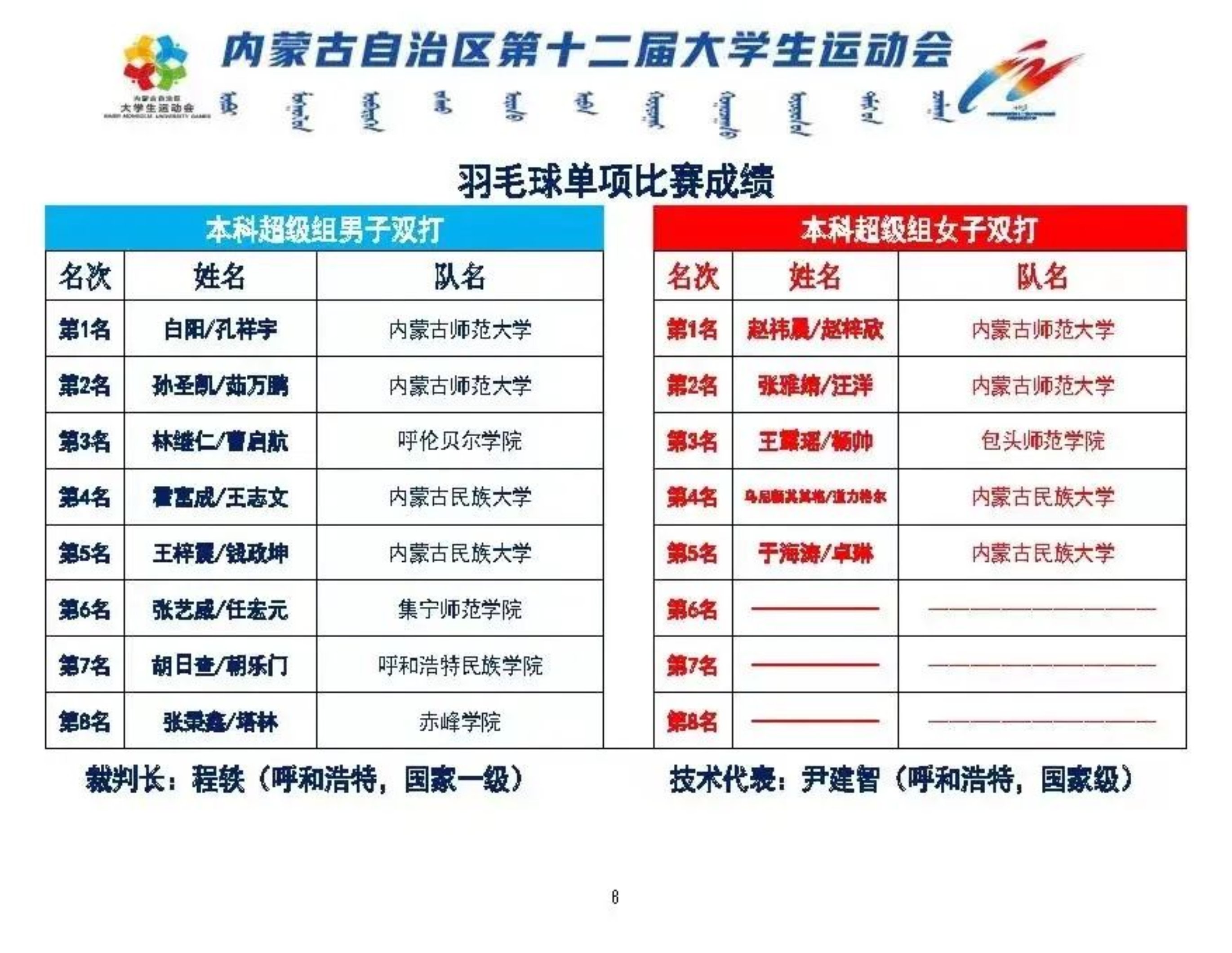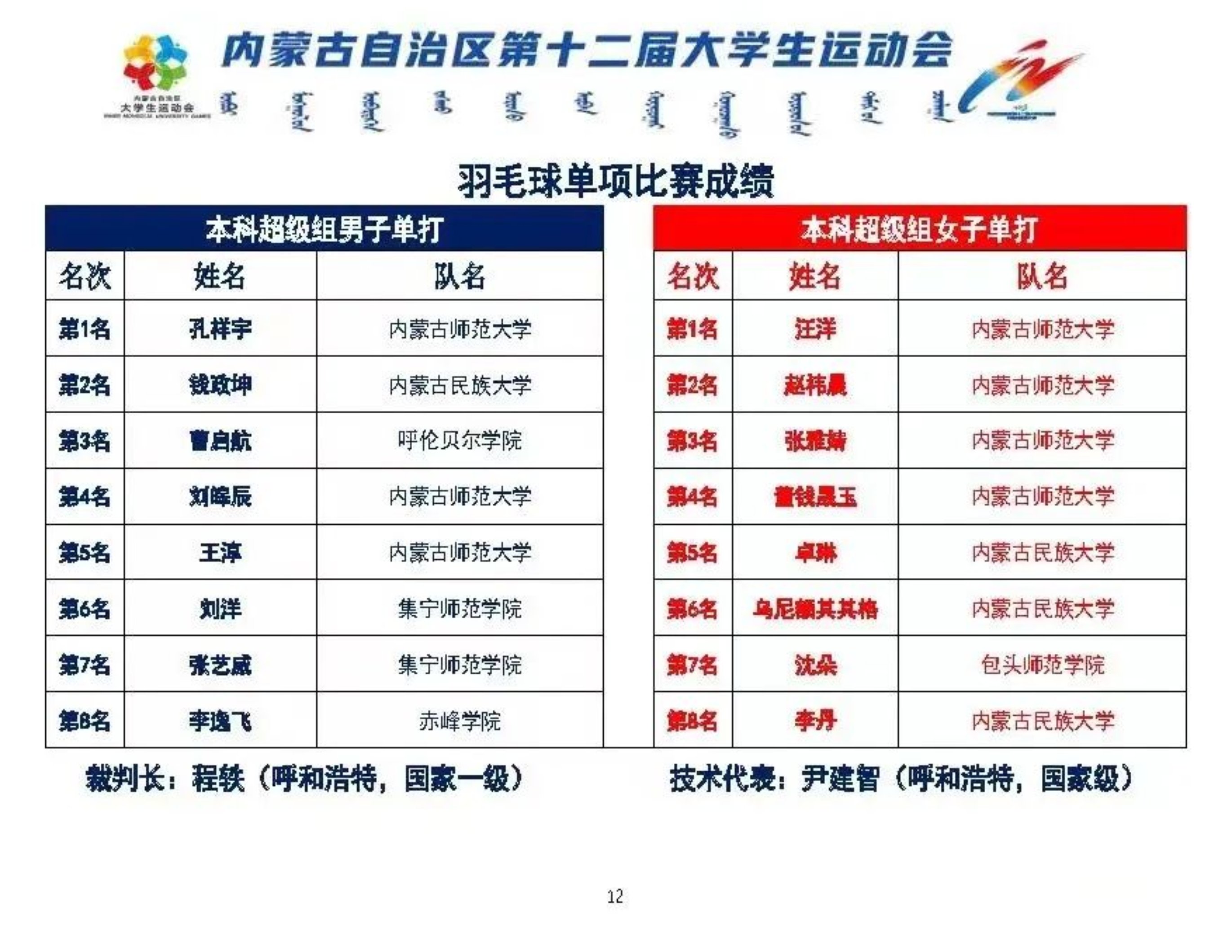 5月31—6月6日,内蒙古自治区第十二届大学生运动会羽毛球比赛在内蒙古财经大学成功举办。经过比赛的激烈角逐,beat365官方网站羽毛球代表队获得本科男子超级组团体第五名;张秉鑫、塔林在本科男子超级组双打获得第八名;李逸飞在本科男子超级组单打获得第八名的成绩。