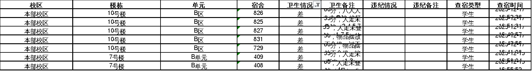 本周抽查男女生宿舍共计57间,其中卫生情况为差(即60分及以下)的宿舍有如下7间,现予以公示: