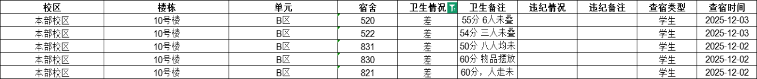 本周抽查男女生宿舍共计52间,其中卫生情况为差(即60分及以下)的宿舍有如下5间,现予以公示: