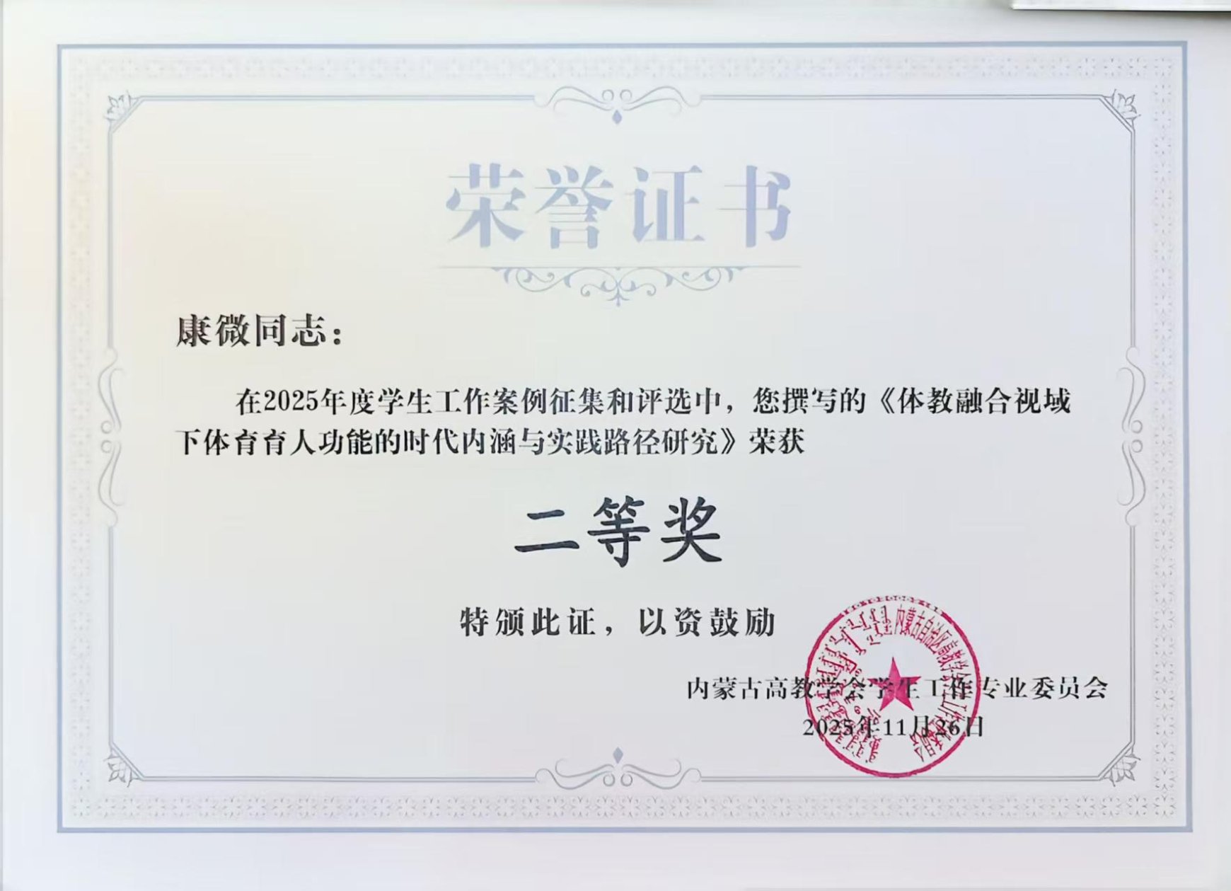 近日,2025 年全区高校 “一站式” 学生社区建设提质增效培训班暨全区辅导员骨干示范培训班在内蒙古民族大学举行,会上对 2025 年度全区优秀学生工作案例进行表彰。beat365康微老师撰写的《体教融合视域下体育育人功能的时代内涵与实践路径研究》案例,从全区高校报送的 107篇案例中突围,荣获二等奖。