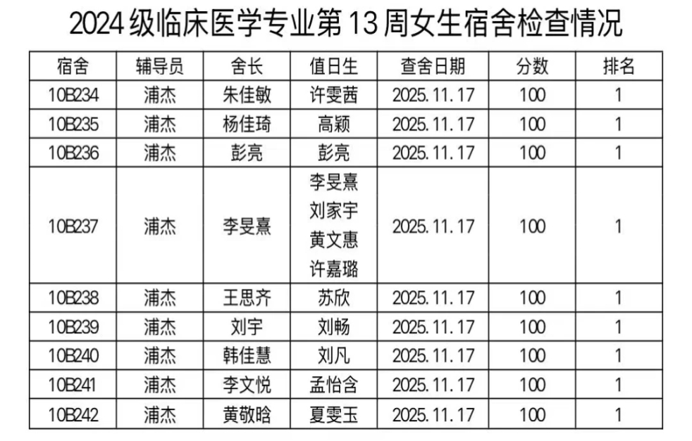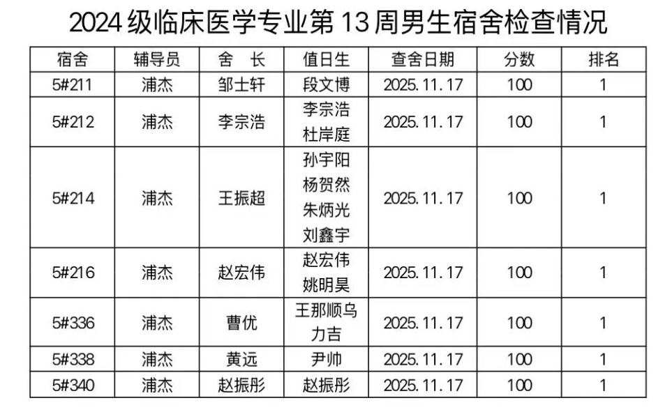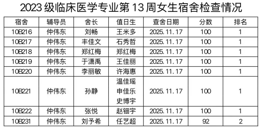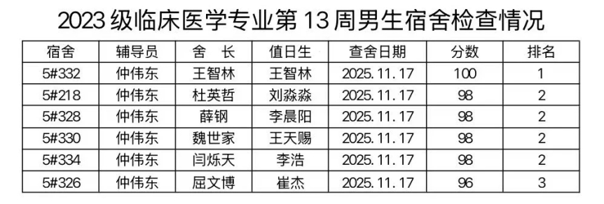 2025年11月17日,临床医学院公示2025-2026学年第一学期第十三周校本部学生宿舍安全及内务检查结果。此次检查由临床医学院学生会及各组织开展,涉及2023级、2024级、2025级学生宿舍,公布了各宿舍分数、排名及优秀宿舍展示,同时指出部分宿舍存在插排未断电、物品摆放不整齐等问题。