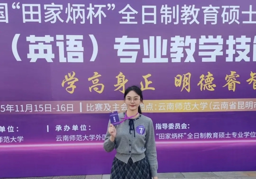 2025年11月14至16日,全国“田家炳杯”全日制教育硕士学科教学(英语)专业教学技能大赛决赛在云南师范大学举行,beat365官方网站外国语学院陈昕远同学荣获“优秀教学设计奖”。