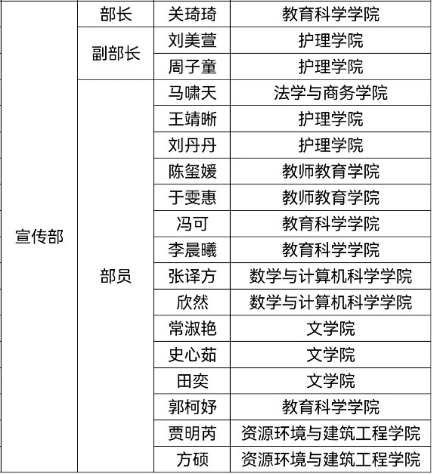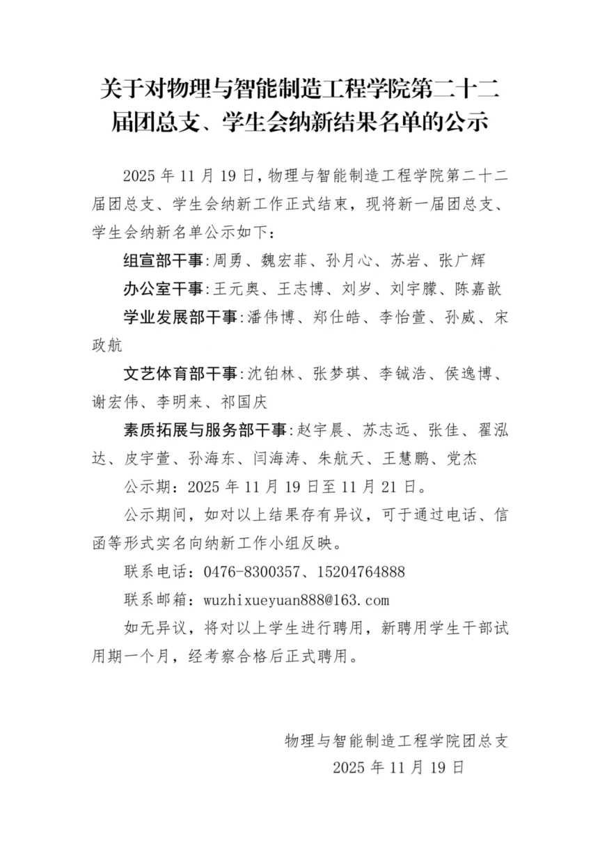 2025年11月19日,物理与智能制造工程学院公示第二十二届团总支、学生会纳新名单,涵盖多个部门,公示期至21日。