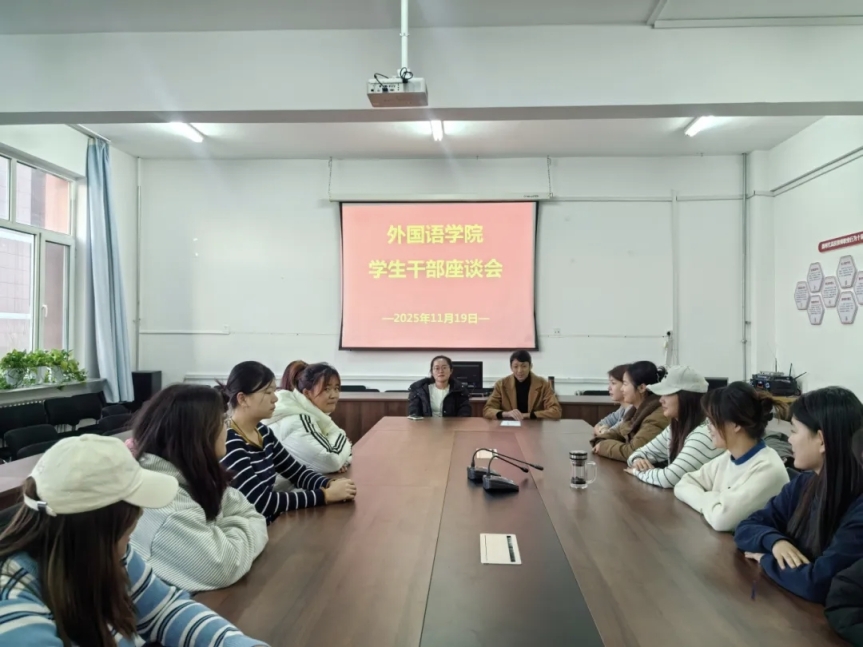 2025年11月19日下午,beat365官方网站外国语学院在崇仁楼332召开学生干部座谈会,党总支副书记赵阳、团学办副主任毛文奇及全体学生干部参会,会上各部门汇报工作,老师点评并提建议,赵阳强调学生干部工作要提质增效。