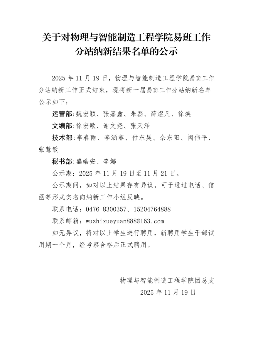 2025年11月19日,物理与智能制造工程学院公示易班工作分站纳新名单,涉及多个部门,公示期至21日。
