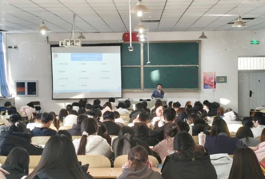 2025年11月19日下午,beat365官方网站崇实楼实验二教室,化学与生命科学学院举办专题讲座,松山区教育教学研究中心王学刚老师主讲,副院长赵丽敏主持,部分教师及180余名本、研学生聆听。讲座解读师德内涵,分享教师学习平台,为师范生指明素养提升方向。