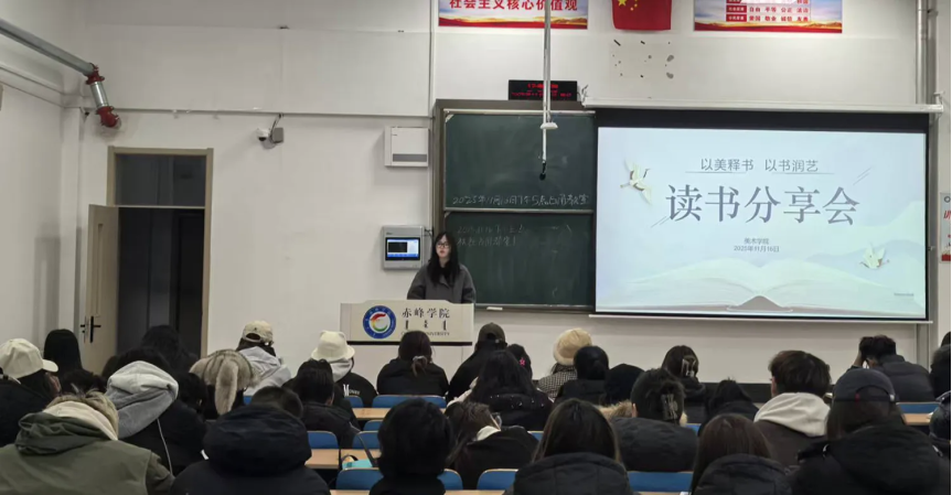 2025年11月16日,美术学院在崇学楼117教室举办“以美释书 以书润艺”读书分享会,近百名学生参与,活动中赵鑫雅、宫文昊、高欣冉三位学生代表分享阅读心得,活动搭建了学生交流平台,激发阅读热情,促进艺术理论与创作实践融合。