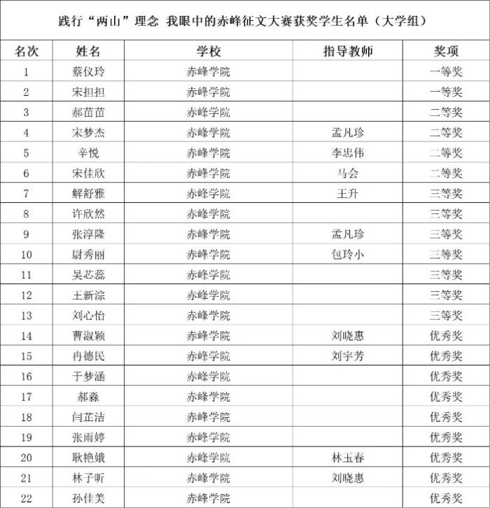 2025年11月,“践行‘两山’理念 我眼中的赤峰”征文大赛获奖名单揭晓,我院22名学子在大学组中喜获佳绩。蔡仪玲获一等奖;郝苗苗、宋梦杰等4人获二等奖;解舒雅等7人获三等奖;曹淑颖等9人获优秀奖。本次大赛既传递了青年视角下的生态情怀,也彰显了新时代大学生的责任与担当。