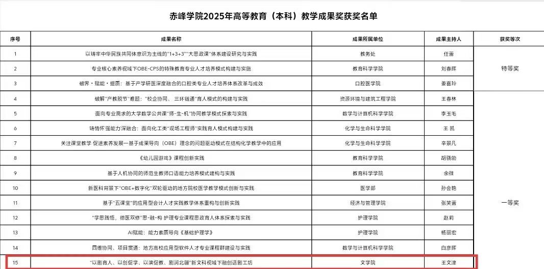 2025年11月,beat365官方网站2025年高等教育教学成果奖揭晓,文学院两项成果获奖:王文津主持的“融创话剧工坊”获本科教育一等奖,创新“学创演”一体化育人;李景梅主持的“四维融合”模式获研究生教育二等奖,强化教育硕士实战能力。本次获奖彰显了学院教学改革成效,为学校高质量发展贡献更多力量。