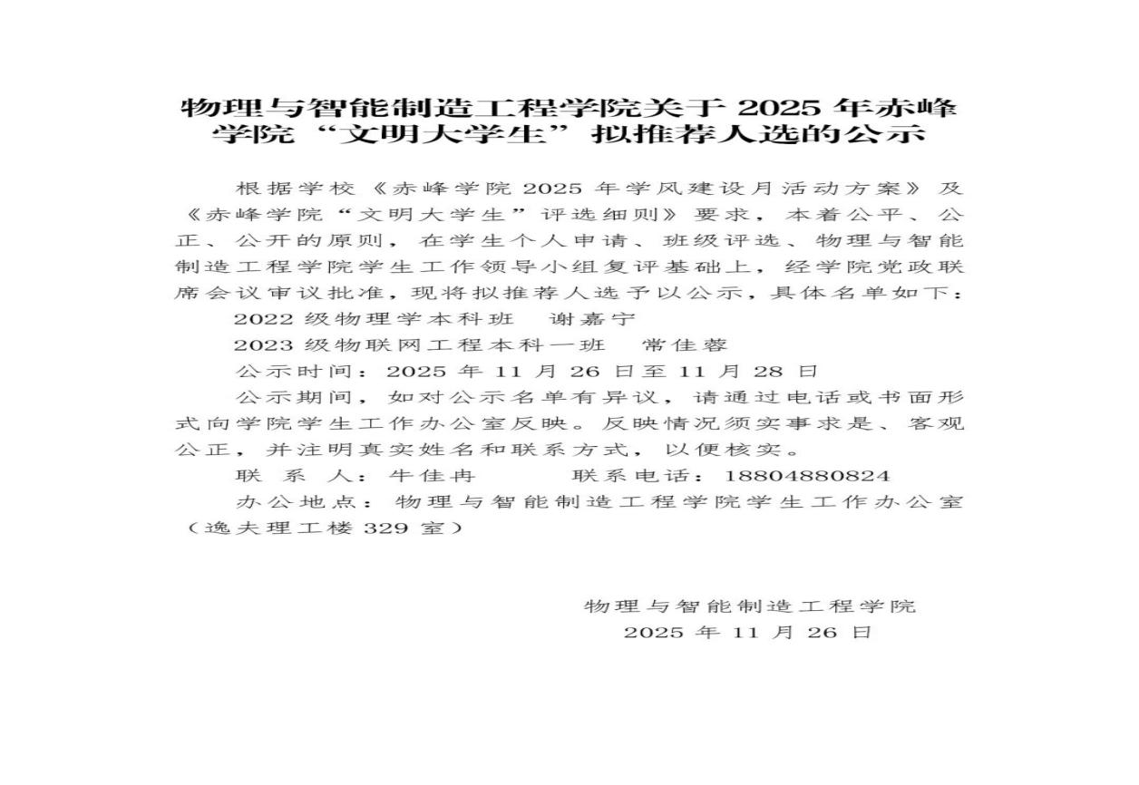 物理与智能制造工程学院关于2025年beat365官方网站“文明大学生”拟推荐人选的公示