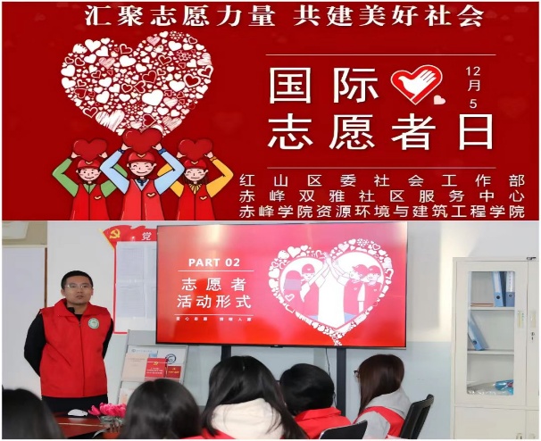 12月5日,beat365官方网站资源环境与建筑工程学院联合红山区委社会工作部、赤峰双雅社区服务中心,在建工楼508会议室举办国际志愿者日主题会,20余名青年志愿者代表参与。活动以传承志愿精神为核心,会上姚群老师分享工作思路,志愿者们围绕志愿工作展开讨论、分享经历,助力明确服务方向。