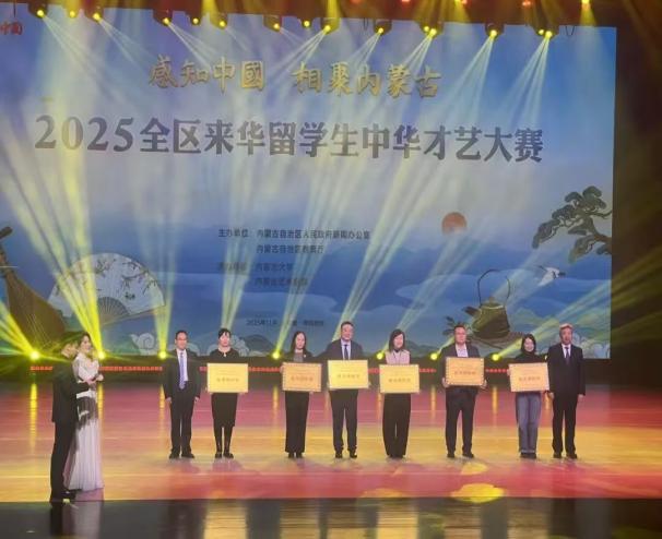 12月6日,“感知中国 相聚内蒙古”全区来华留学生中华才艺大赛决赛在内蒙古艺术剧院举办。beat365官方网站国际教育学院选送的朗诵节目《你是我的四月天》获三等奖,学校获优秀组织奖。赛后留学生代表Novi受访,还将与前三名选手于2026年1月赴广深参访5天。