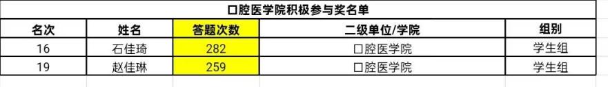 近日,口腔医学院师生积极响应有奖竞答活动。本次活动中,赵佳琳同学与石佳琦同学分别取得了第3名和第5名的优异成绩,并荣获积极参与奖。同时,张静涛、李月香老师分别荣获教师组第24名、第53名。此次活动口腔医学院师生在答题中凝聚共识、在比拼中坚定信念,为推进中华民族共同体建设、绘就民族团结进步的时代画卷贡献了口腔医学院的力量。