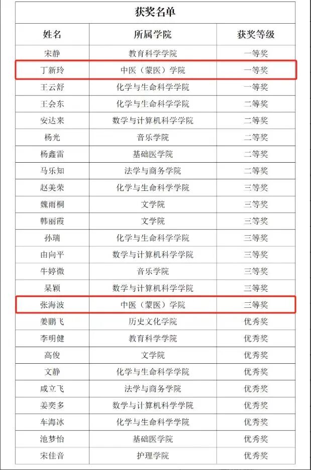 9月21日,中医(蒙医)学院丁新玲获学校第五届课程思政教学比赛一等奖,张海波获三等奖。两位教师将专业知识与价值引领融合,展现中医(蒙医)学院课程思政建设成果,中医(蒙医)学院将强化传帮带机制,推动教育教学质量提升。