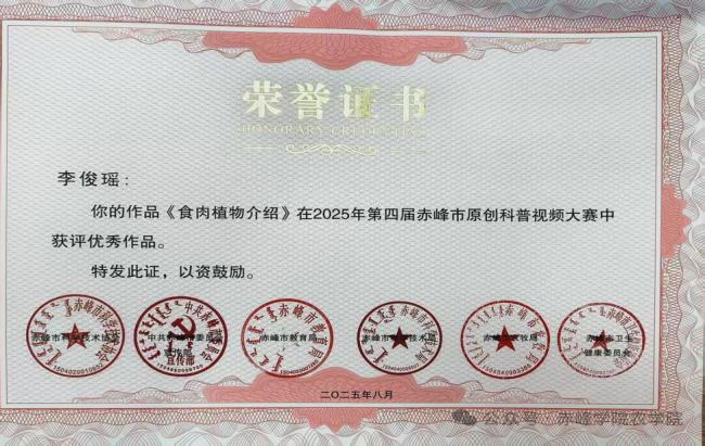 近日,农学院张丽老师指导的3项学生科普作品在第四届赤峰市原创科普视频大赛中获奖。获奖作品通过不同主题科普植物科学知识,此次获奖体现学院注重培养学生创新创业能力和科学素养,农学院将继续推动产学研融合,输送优秀人才。