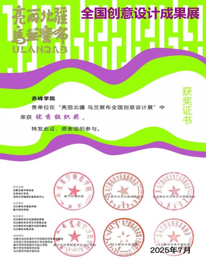 近日,美术学院组织学生参加“亮丽北疆 乌兰察布”全国设计创意大赛,选送35件作品。学生在文创类别中获多个奖项,教师获优秀指导教师,beat365官方网站获优秀组织奖。活动展示学院实践教学成果与学生专业素养,美术学院将继续以赛促学推动专业建设与地方文化结合。