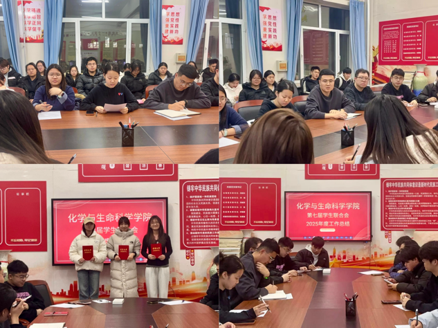 123019:00,化学与生命科学学院第七届学生会在崇实楼408召开2025年度工作总结会议,各部门述职复盘成果与不足,化学与生命科学学院老师点评并提改进意见,现场评选表彰3名优秀骨干,明确了未来工作方向。