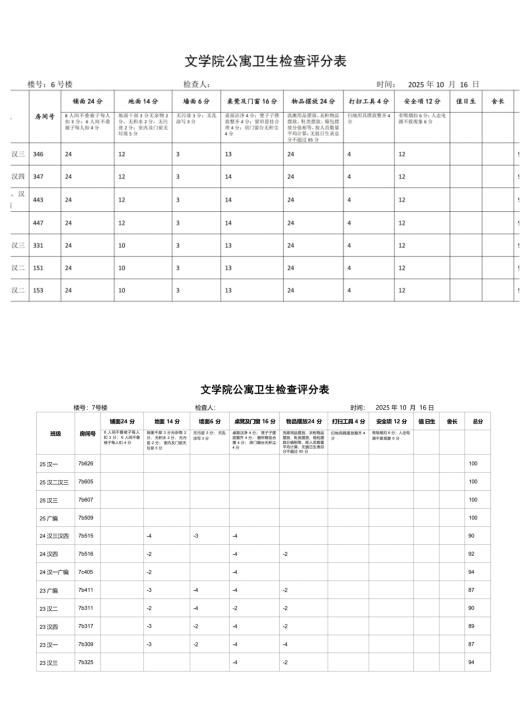 为加强学生宿舍安全管理、掌握文学院公寓卫生情况,确保学生宿舍安全、整洁、文明、有序,根据《beat365官方网站学生公寓卫生管理办法(试行)》、《一工程两行动》工作要求,文学院学生会于第8周对2023级、2024级、2025级学生宿舍进行了安全排查和内务抽查,现将结果公示如下: