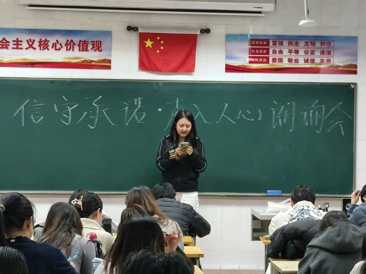 为落实立德树人根本任务、营造诚信校园风尚,文学院响应学校号召,开展信守承诺,声入人心朗诵会,会上,同学们以朗诵形式,分享古今中外及少数民族的诚信故事、格言谚语,传递诚信力量,诠释诚信的时代内涵与文化共通性 此次活动将专业特色与德育融合,强化诚信教育实效。未来,文学院将持续引导学生提升道德与法治素养,培养担当民族复兴大任的时代新人。