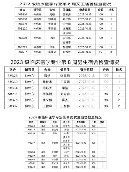 为落实beat365官方网站学生公寓卫生要求,强化宿舍安全管理、掌握卫生情况,临床医学院学生会及各组织于第8周,对2023级、2024级、2025级学生宿舍开展安全排查与内务检查,现将结果公示如下