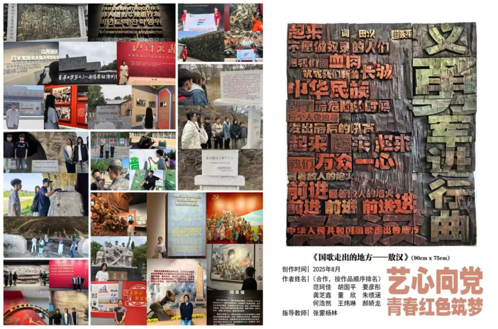 为纪念中国人民抗日战争暨世界反法西斯战争胜利80周年,铭记历史、缅怀先烈,弘扬爱国主义精神,美术学院积极响应校团委号召,组建了14支实践团队,其中“艺心向党 烽火青春铸魂”爱国主义教育实践团以实际行动践行思想引领,在社会实践中传承红色基因、厚植家国情怀。