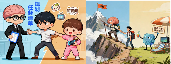 人有两个相对立的脑区,它们促使了我的诞生。一个是前额叶皮层,它像是一位管家负责理性规划;另一个是边缘系统,它像任性的孩子只追即时愉悦、逃避痛苦。当任务触发挫败感、恐惧感和焦虑时,边缘系统就会“劫持”注意力,将你引向刷手机、追剧等能快速获愉悦的事上,帮你暂时逃离心理痛苦。